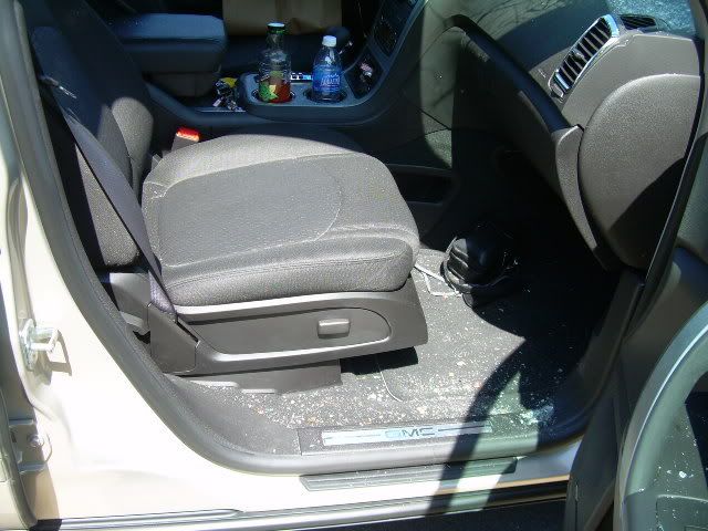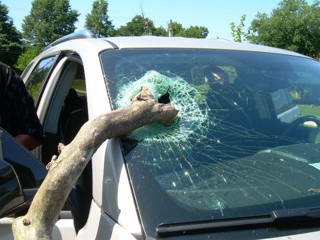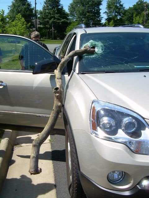 Lo and behold, there is a TREE LIMB through our windshield. Of course, I was sitting in the seat where it came through, so there are ants and bits of tree bark and glass shards and all this crap EVERYWHERE. o_O;; My mom's poor Acadia... T_T We'd had the car for, like, a month? So we had to duct tape-and-Plexiglas it, and then drive it home like that because we couldn't get it fixed where we were. What a trip...