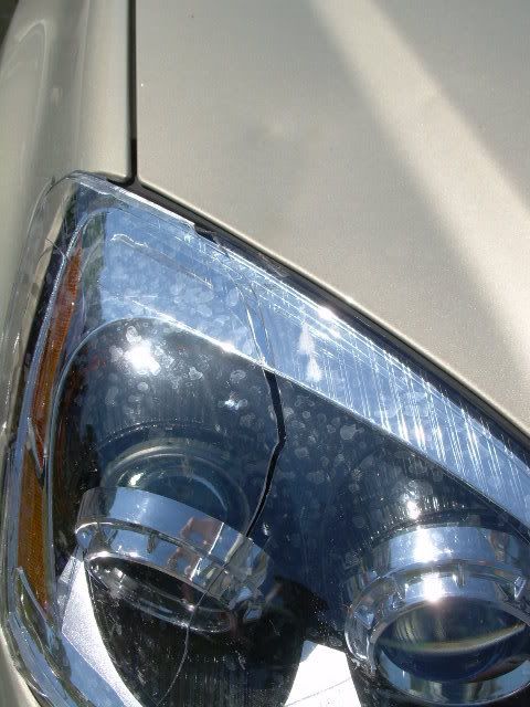 Here are some pictures of the damage: the hole through the windshield, the dent in the hood, glass in the car, and broken headlight. ^^;